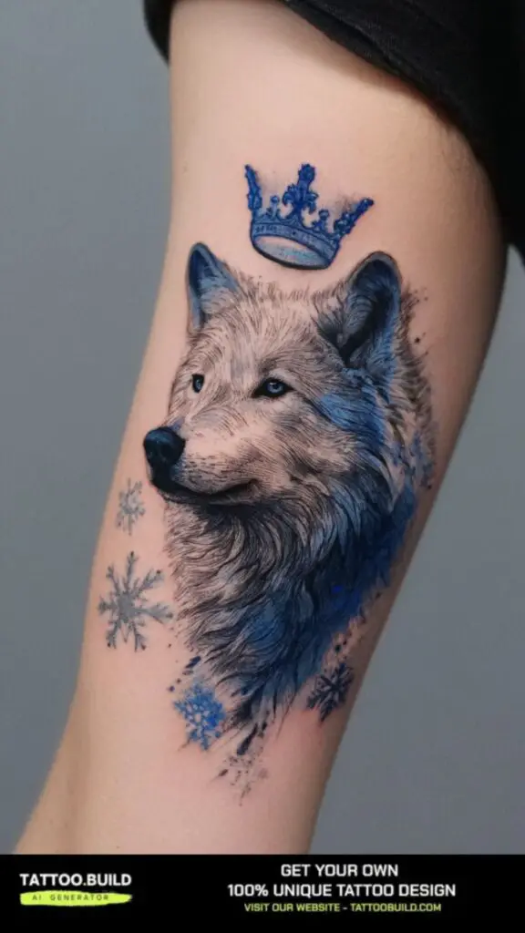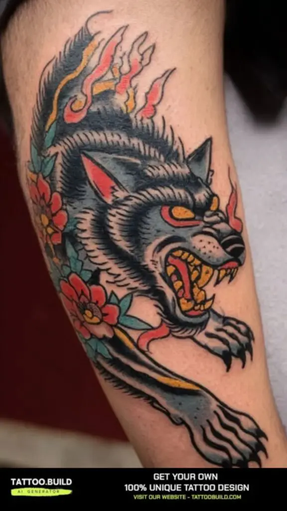 Highlights the mystical, free-spirited side of the wolf, making the design feel dynamic and unique. This tattoo is popular for those who want a tattoo that feels more like artwork than illustration.