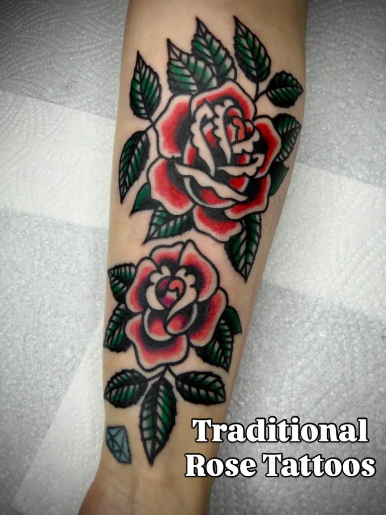 A rose in traditional American style with the petals in bold red and the stem, leaves, and outlines in solid black. The traditional American rose in black and red is one of the most classic tattoo designs in existence. Bold, legible, beautiful, and proven to age well. The red fills the petals, the black defines everything.