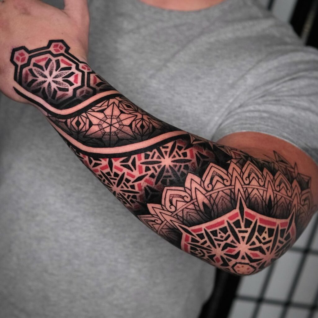 The black and red palette works because the colours occupy different visual roles. Black creates structure, depth, and shadow. Red creates emphasis, heat, and vitality. In a black and red tattoo, the black typically forms the foundation and the red either fills specific areas or adds an accent that draws the eye. The relationship between how much black and how much red is used changes the character of the piece dramatically.