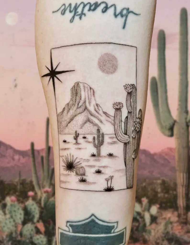 A full desert landscape tattoo: a straight road, cactus on both sides, the horizon in the distance, maybe a mountain. The vast, open quality of desert landscapes. In blackwork silhouette for maximum impact or in fine line for intricate detail.