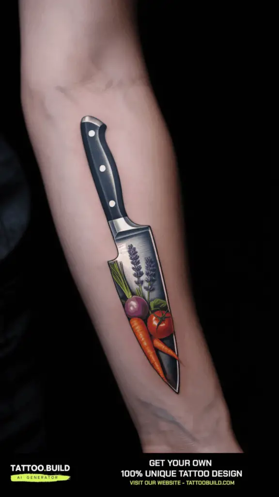 The chef’s knife is the quintessential symbol of the profession, representing skill, precision, and dedication. These tattoos range from minimalist line drawings to highly detailed, neo-traditional styles featuring knives paired with other kitchen elements like flames, skulls, or chef hats. Some designs incorporate unique color palettes or cosmic themes, making a bold statement about mastery and passion in the kitchen.