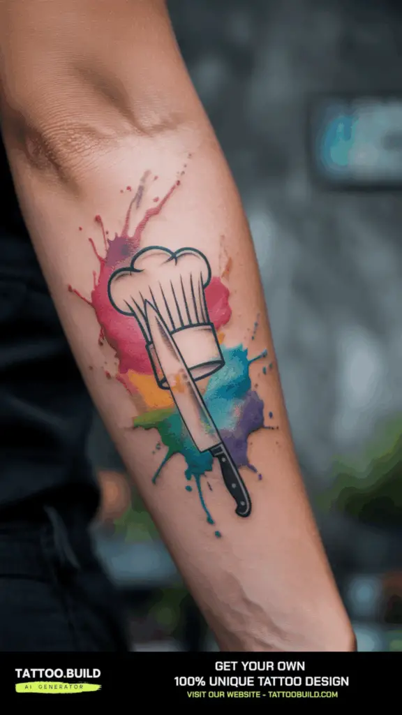 Watercolor tattoos incorporate splashes of color and fluid brushstroke effects, often used to depict ingredients like herbs, spices, or vibrant dishes. This style adds an artistic, painterly quality that reflects the creativity and flair of chefs.