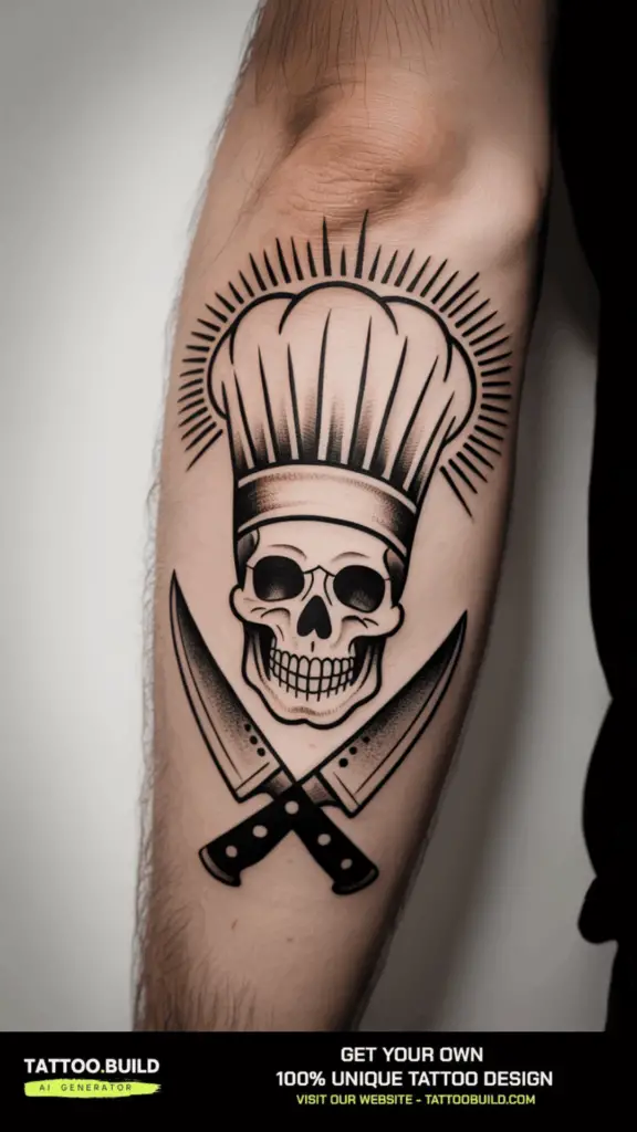 The chef’s hat symbolizes authority, seniority, and pride in the profession. Some chefs combine this with skull imagery to express resilience, toughness, and a fearless attitude toward the demanding kitchen environment. These tattoos often carry a rebellious edge, blending traditional tattoo motifs with culinary themes.