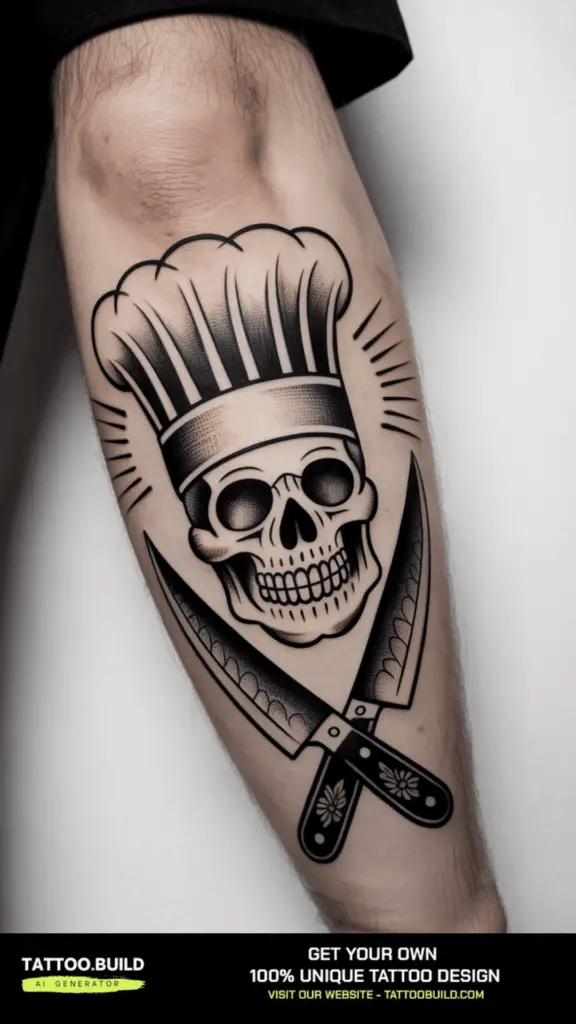 These styles feature bold lines, vibrant colors, and classic tattoo motifs. Traditional chef tattoos often include iconic symbols like chef knives, hats, or skulls in uniform, rendered with strong outlines and shading. Neo-traditional designs add more detail and depth while maintaining the boldness, making them visually striking and timeless.