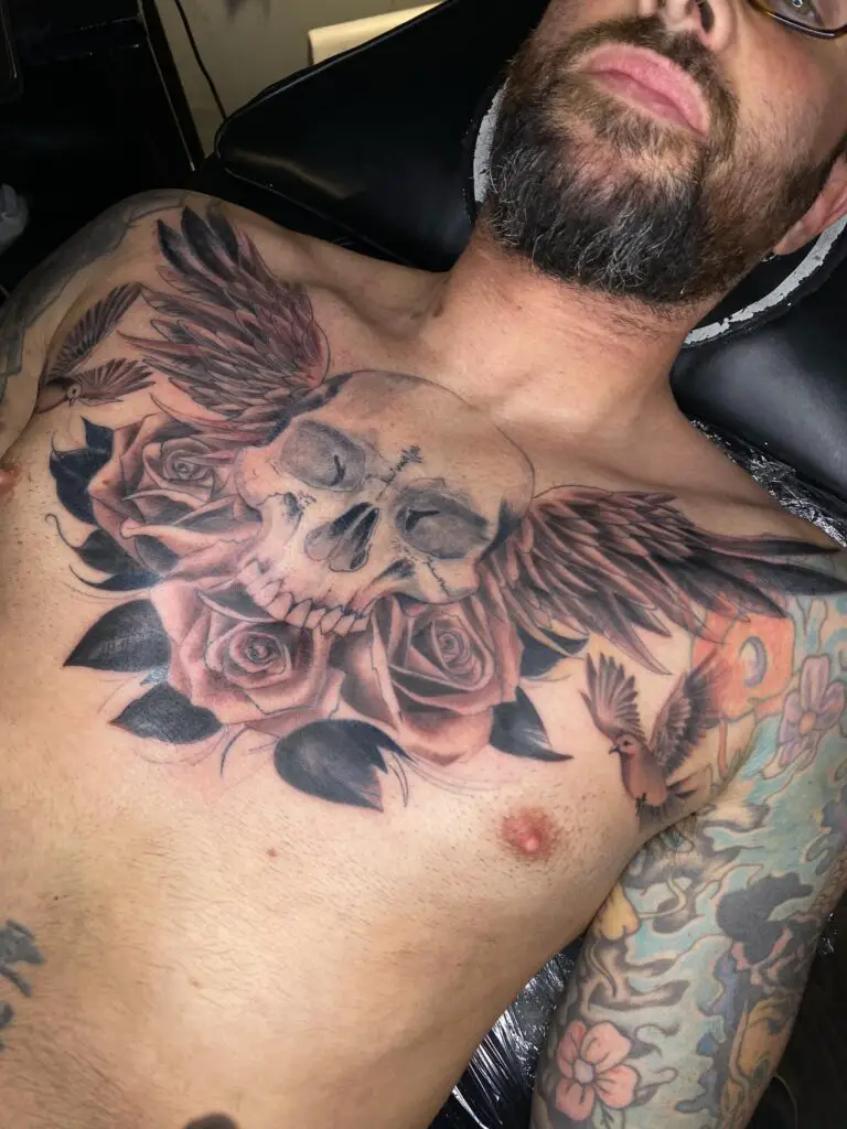 A skull centred on the sternum with roses or floral elements extending across the chest. The memento mori tradition made personal. The skull acknowledges mortality; the roses acknowledge beauty. Together they form a statement about the coexistence of both. Traditional or neo-traditional in style.