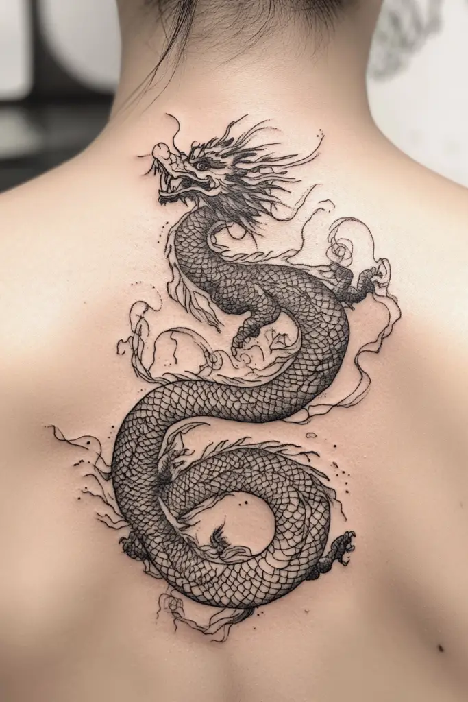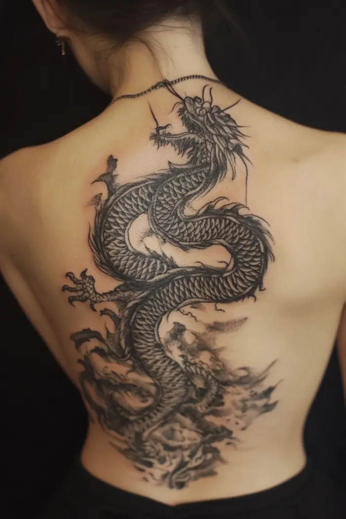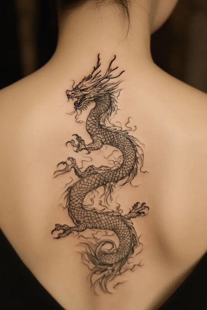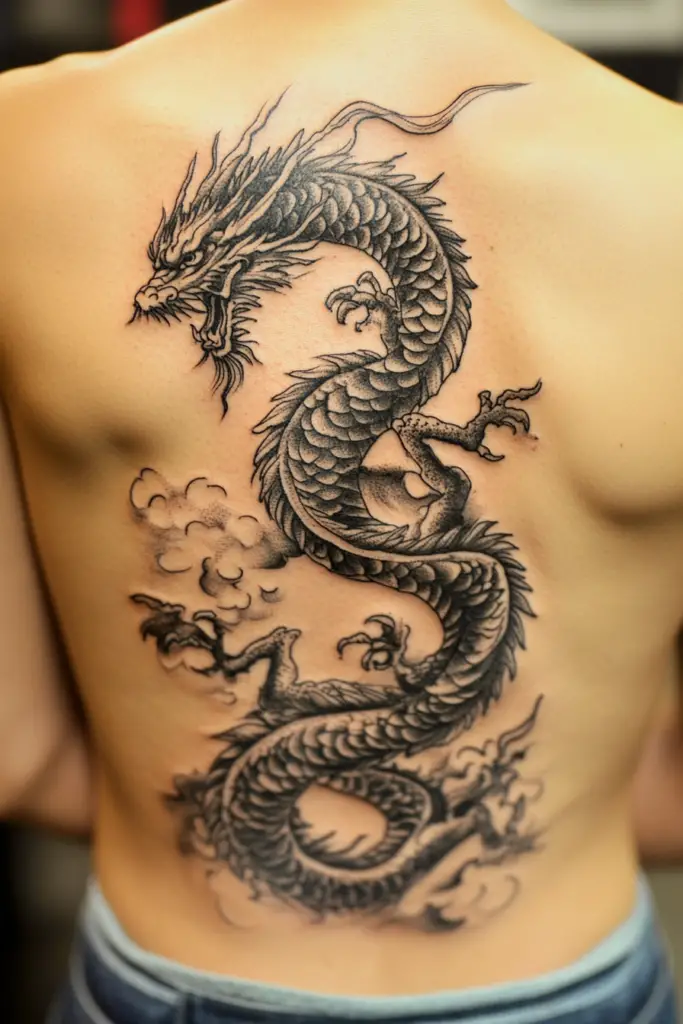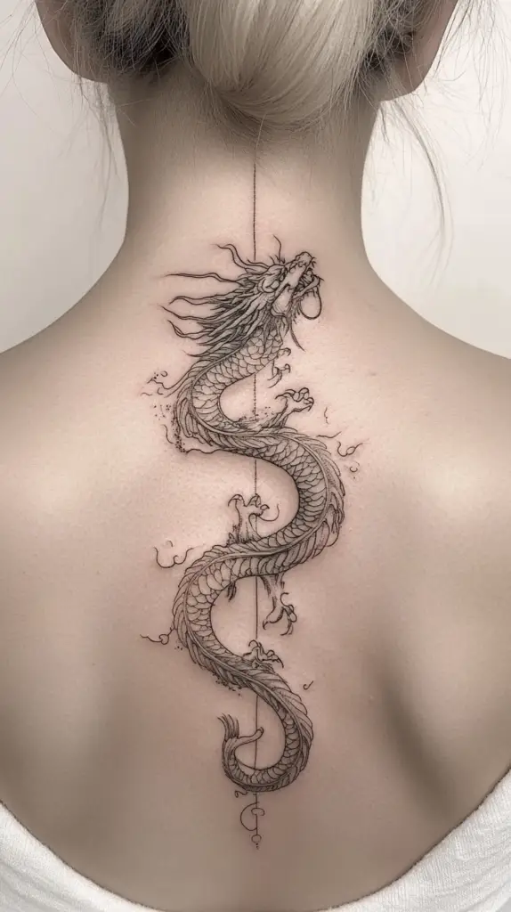 A Chinese dragon tattoo that follows the spine’s curvature can represent the wearer’s backbone in facing life’s challenges, a visual and symbolic representation of perseverance and courage.
