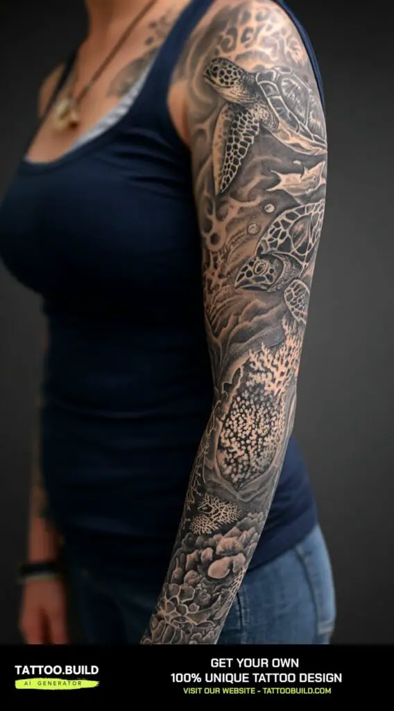 An ocean sleeve tattoo featuring dolphins, turtles, and a vibrant coral reef offers a refreshing and lively celebration of marine life. Dolphins symbolize playfulness and intelligence, while turtles represent longevity and wisdom, creating a balance of energy and calm throughout the design.