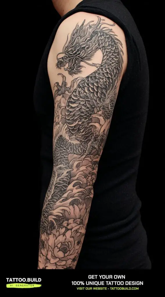 A mythical dragon in an elegant Japanese style makes for a striking and culturally rich sleeve tattoo. Japanese dragons are revered as symbols of wisdom, strength, and protection, often depicted with flowing, serpentine bodies that wrap gracefully around the arm.