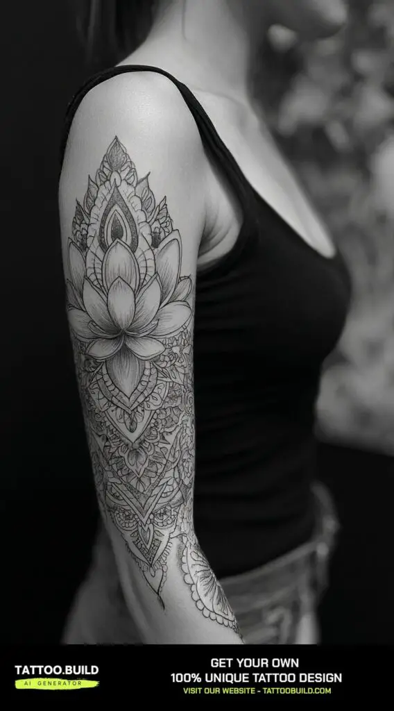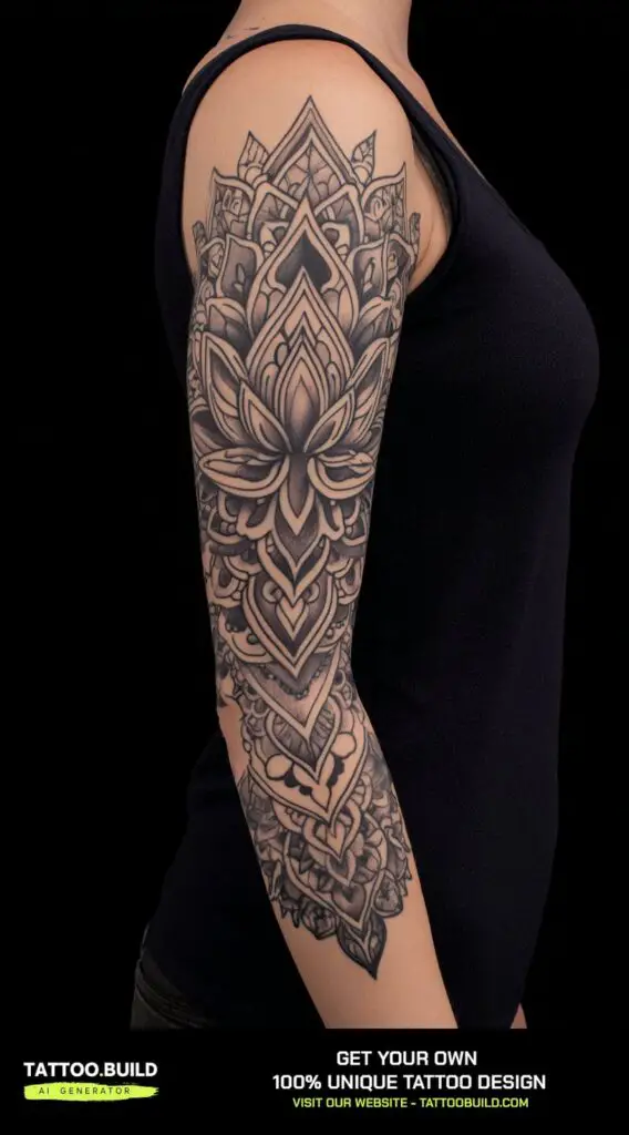 A lotus flower mandala flowing down the sleeve creates a serene and spiritually rich tattoo design. The lotus flower, symbolizing purity, enlightenment, and rebirth, is often revered in many cultures for its ability to rise beautifully from muddy waters.
