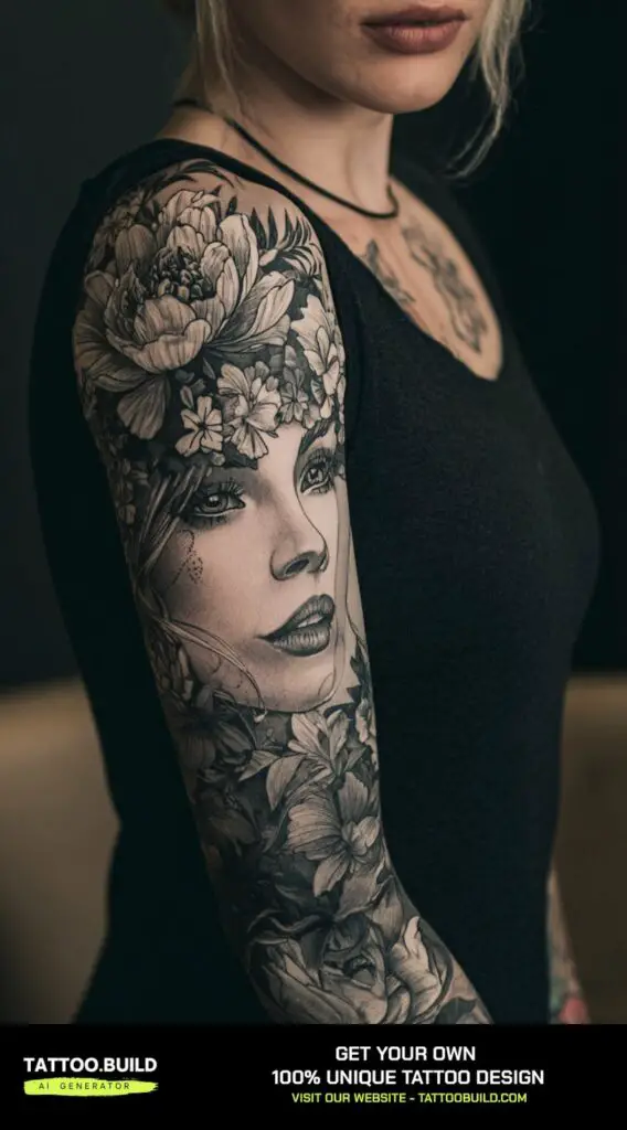 The flowers can carry symbolic meanings such as growth, resilience, and renewal, enriching the tattoo’s narrative. Perfect for women who want to showcase both their inner strength and gentle side, this sleeve is a striking testament to the complex nature of femininity and the harmony between toughness and tenderness.