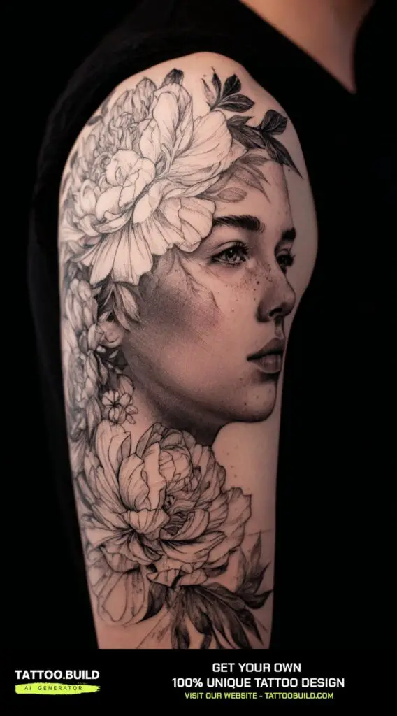 Surrounding her portrait with an array of delicate flowers adds softness and life to the design, creating a harmonious balance between strength and grace. The flowers can also carry their own symbolic meanings, enhancing the overall significance of the tattoo.