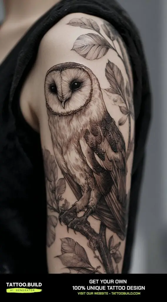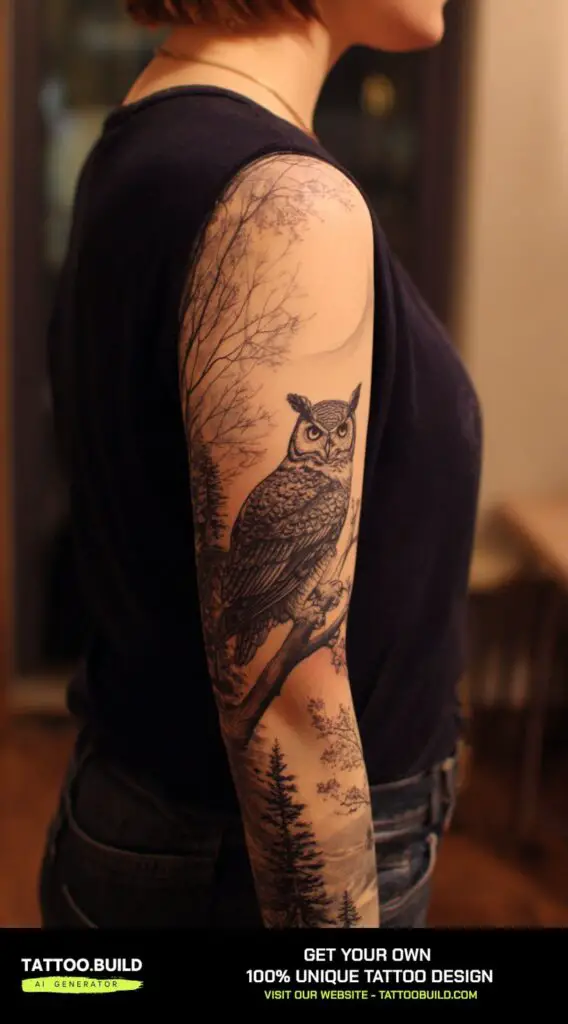 An owl perched on a branch at night makes for a captivating and symbolic sleeve tattoo design. Owls are often associated with wisdom, mystery, and intuition, embodying the ability to see what others cannot in the darkness.