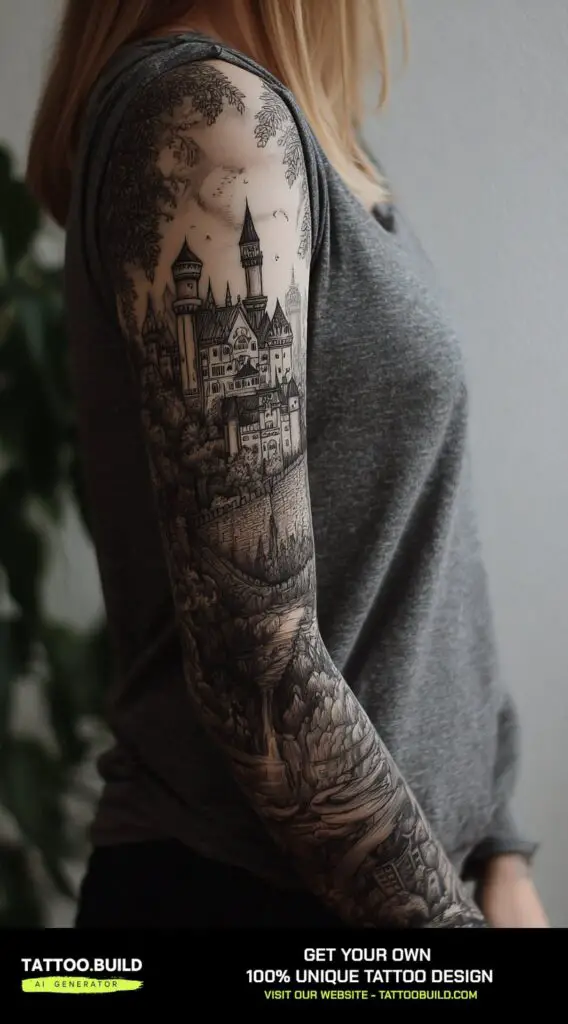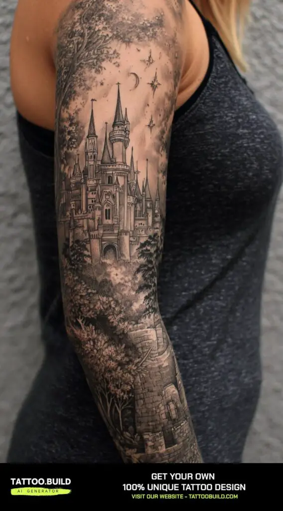 A fairy tale–inspired sleeve tattoo with castles and an enchanted forest creates a whimsical and magical narrative on the arm. This design captures the imagination, blending delicate towers and turrets of castles with the mysterious beauty of a lush, magical forest.