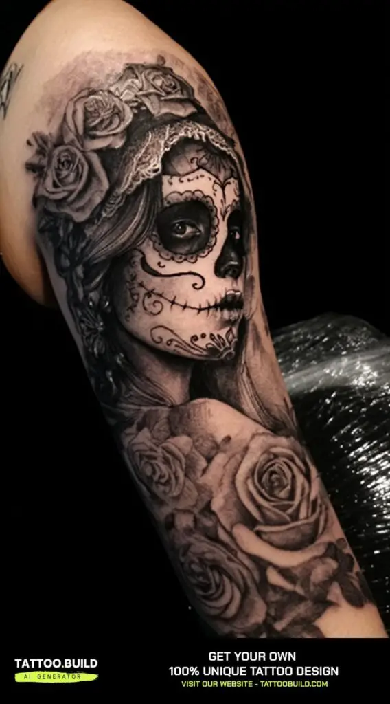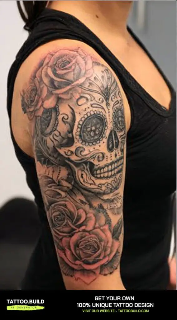 A sugar skull with roses in the Day of the Dead style is a vibrant and meaningful sleeve tattoo that celebrates life, death, and remembrance. The sugar skull, intricately decorated with colorful patterns and symbols, honors departed loved ones and reflects Mexican cultural traditions.