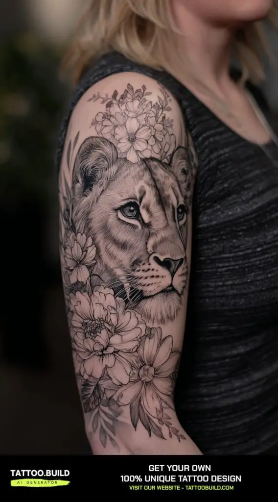 A lioness surrounded by flowers creates a powerful yet graceful sleeve tattoo design that embodies strength, femininity, and nurturing spirit. The lioness, known for her courage and protective nature, represents fierce independence and leadership.