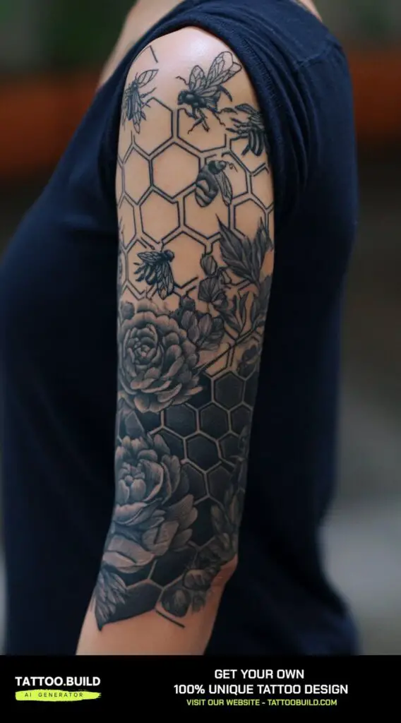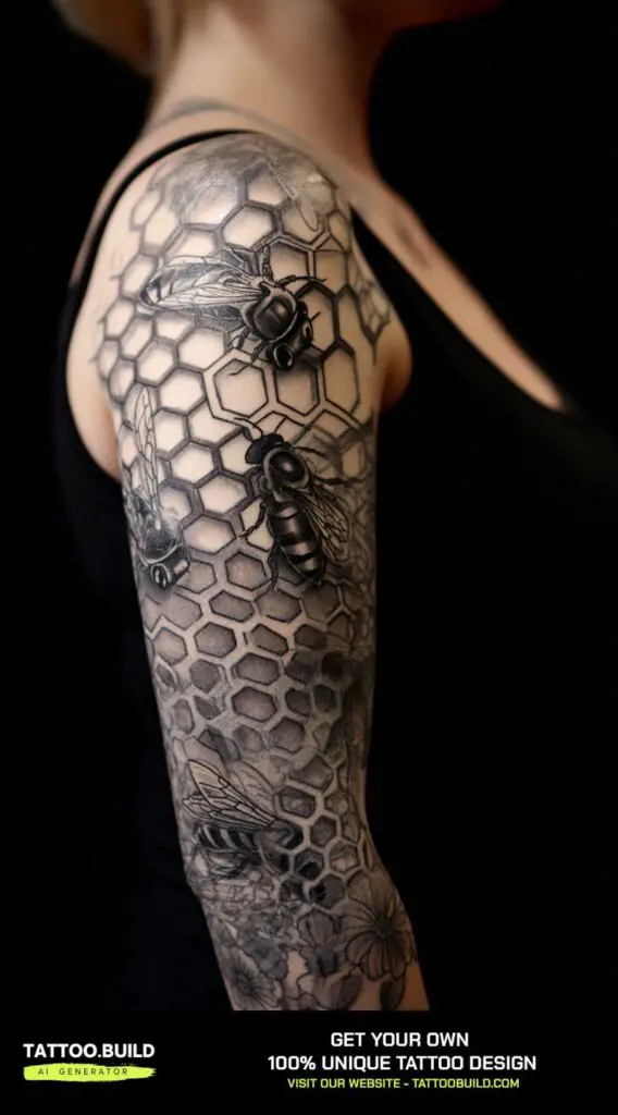 A bee and honeycomb sleeve tattoo with a geometric background blends nature’s precision with modern design, creating a unique and eye-catching piece. The bee symbolizes hard work, community, and productivity, while the honeycomb’s hexagonal cells reflect order, harmony, and efficiency.