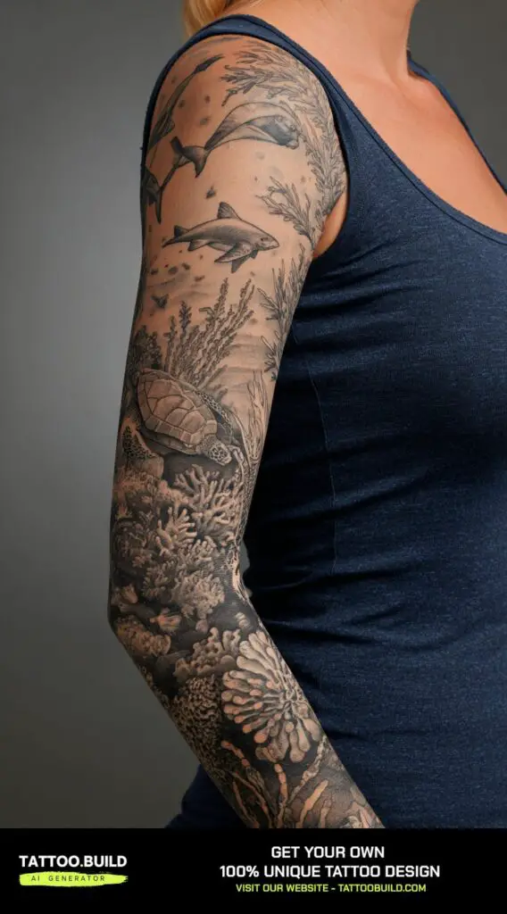 The colorful coral reef adds depth and texture, bringing the underwater scene to life with its intricate shapes and lively hues. Flowing naturally along the arm, this sleeve captures the beauty and diversity of the ocean ecosystem.