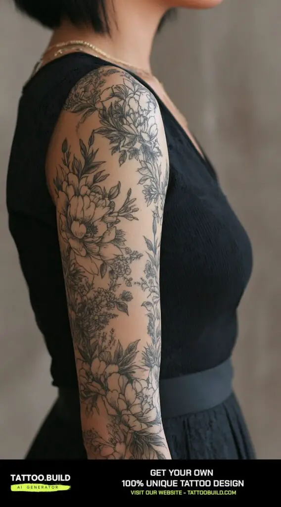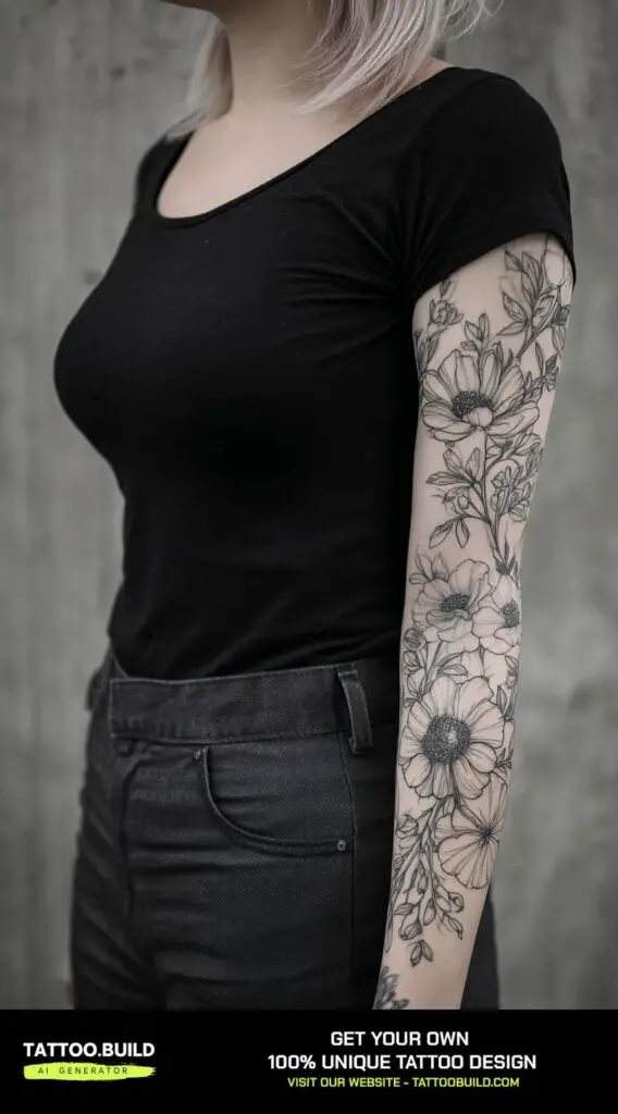 This sleeve provides a light, airy aesthetic that complements any skin tone and personal style. Its versatile elegance makes it a perfect choice for those seeking a meaningful, feminine tattoo that emphasizes form and subtlety over boldness.