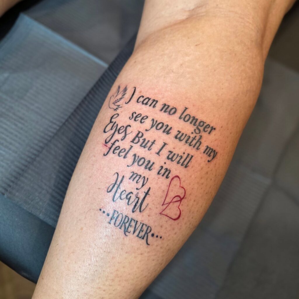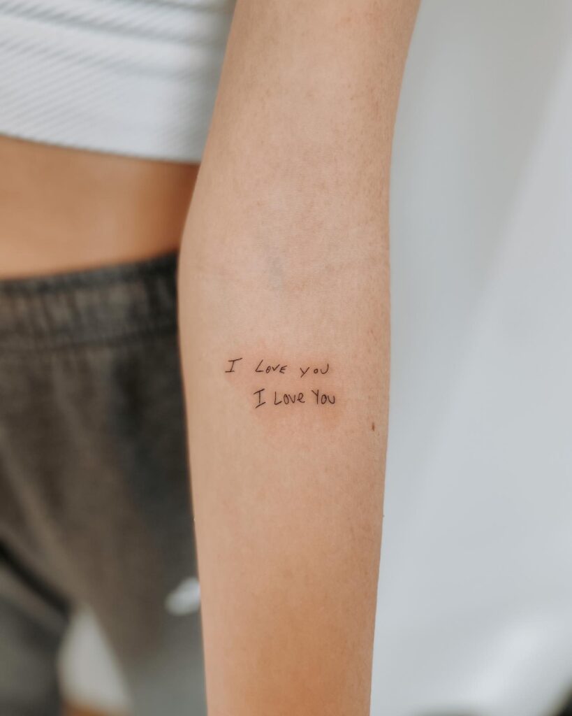 A word, name, or short phrase reproduced from someone’s actual handwriting is one of the most personal family tattoo ideas available. The idiosyncrasies of how someone forms letters carry their character in a way that any typeface fails to replicate. Scan the original carefully. Bring a high-resolution version to your artist.
