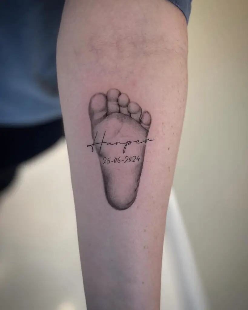 A child’s footprint, typically the outline of a newborn’s foot, rendered in a fine and accurate outline, is one of the most direct memorial or celebration tattoos available to a parent. The proportions should be accurate. A stylised or approximate version misses the point.