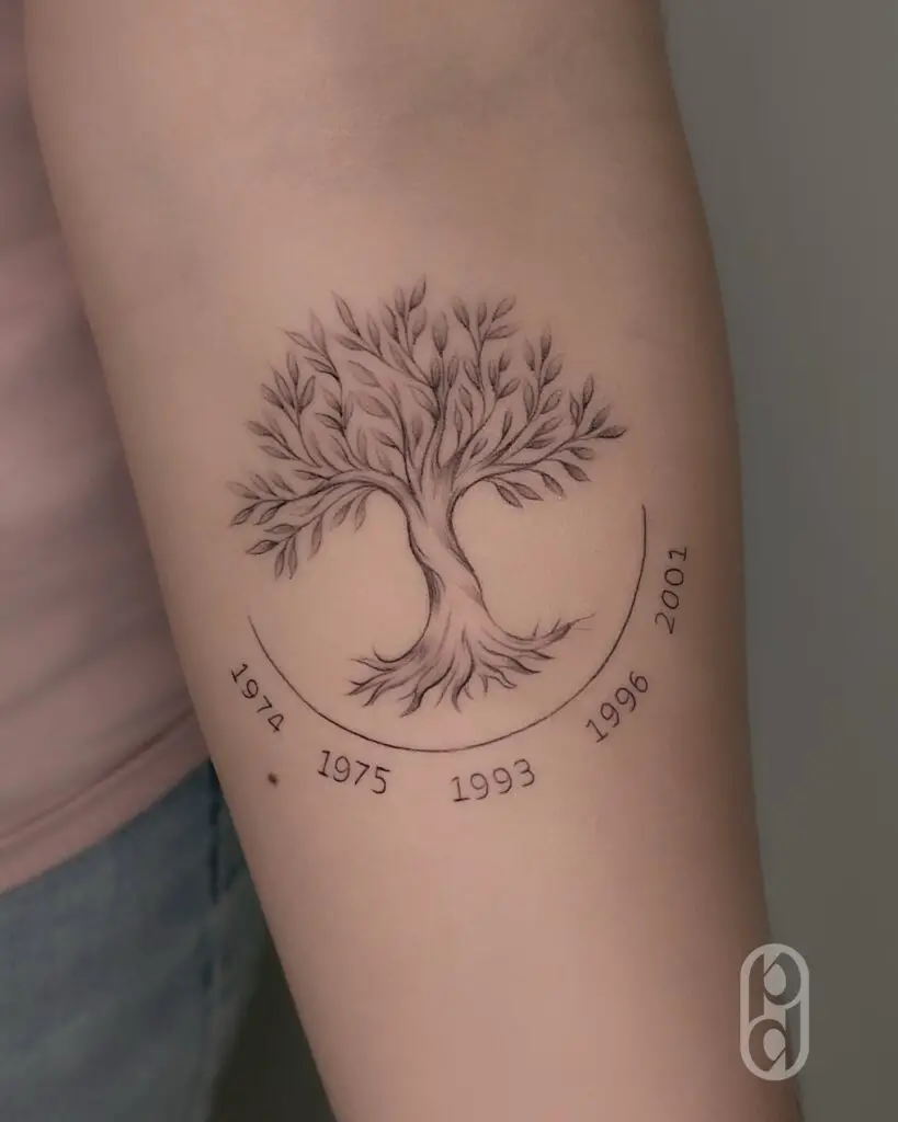 A tree whose branches hold initials, names, or dates corresponding to family members, rendered in fine line or blackwork, creates a literal representation of lineage that works as both symbol and composition. The design grows outward from a central trunk, which suits both the subject and the sleeve or back placements that handle it best.