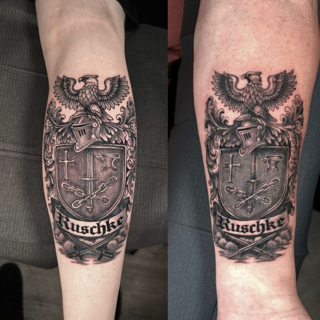 A tattooed representation of a family crest, clan symbol, or cultural heritage emblem connects the wearer to a lineage that extends further back than living memory. Research the authentic forms before commissioning a design. Accurate heraldry and clan symbols have specific visual rules that matter to the people who know them.