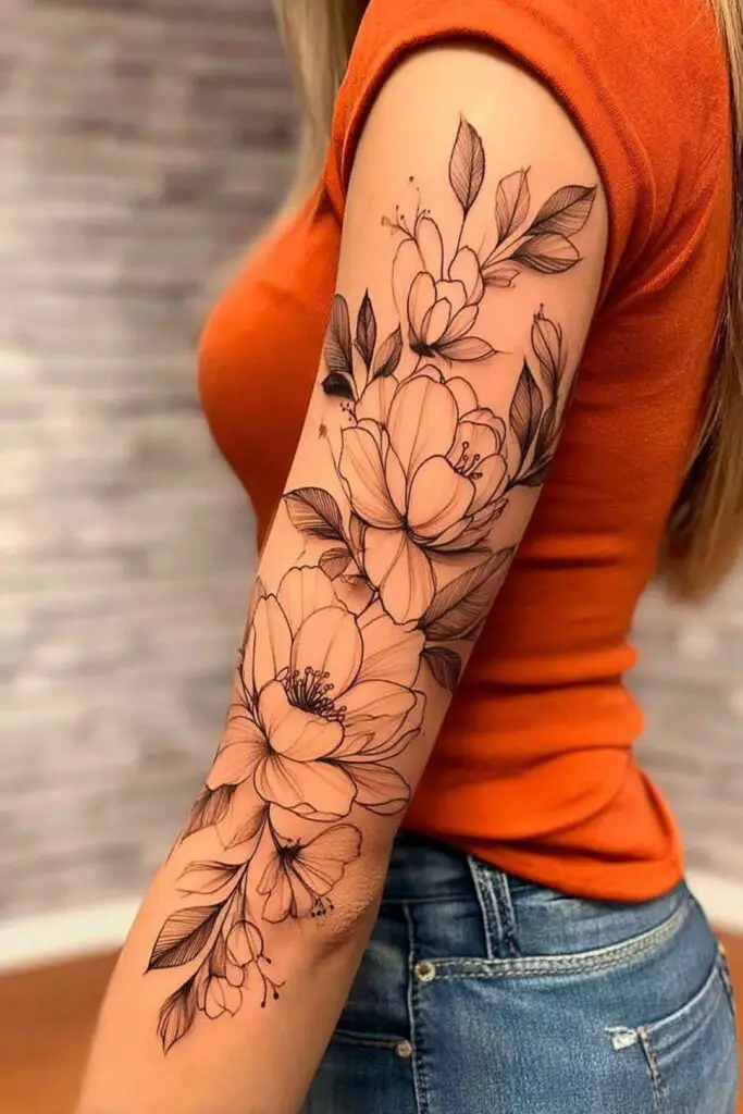 Ideal for women seeking a graceful half sleeve, this design combines subtlety and sophistication, capturing the harmonious balance between delicate floral beauty and refined artistry.