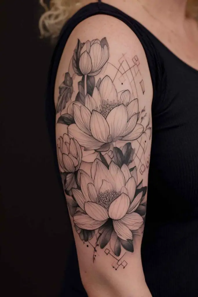 A half sleeve tattoo featuring lotus flowers with subtle geometric accents blends spiritual symbolism with modern elegance. The lotus, a symbol of purity, growth, and rebirth, forms the soft, organic centerpiece of the design, its petals unfolding gracefully along the arm.