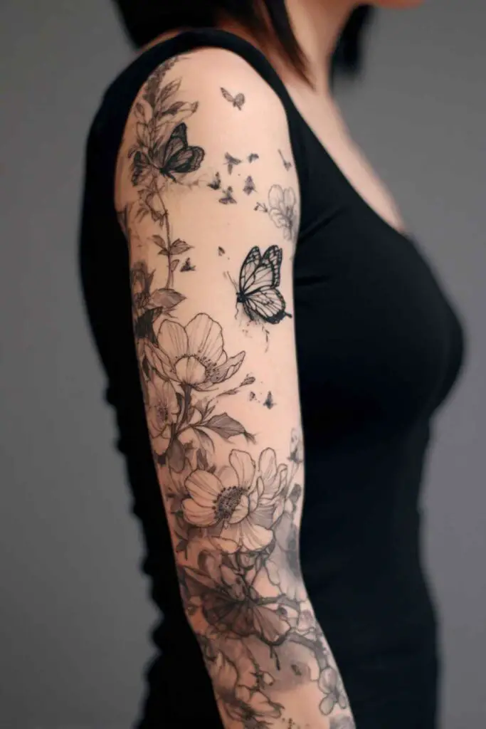 A butterfly-and-floral half sleeve tattoo with elegant negative space creates a design that feels both light and sophisticated. The butterflies symbolize transformation and freedom, delicately fluttering among soft flowers that add a natural, feminine touch.