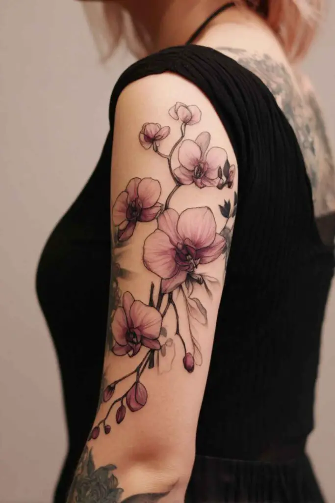 A half sleeve tattoo combining orchids with a long, flowing stem creates an elegant and graceful design that celebrates natural beauty. Orchids, known for their exotic charm and symbolism of strength and femininity, become the focal point, their delicate petals rendered with fine details and subtle shading.