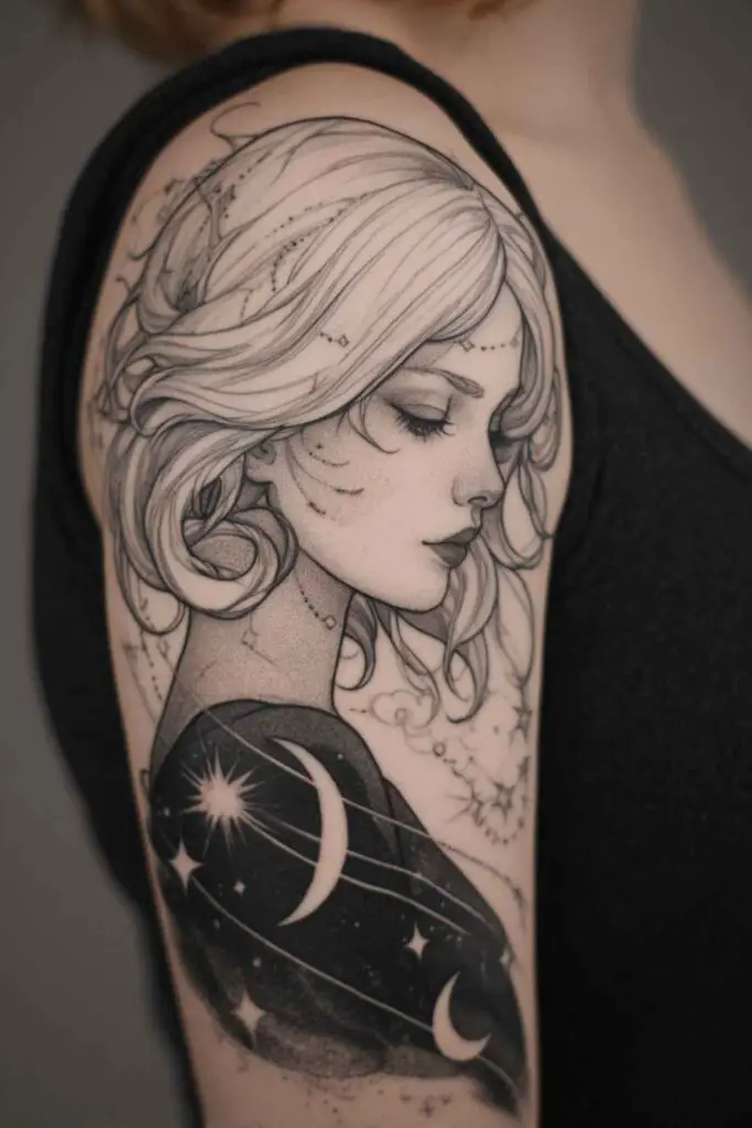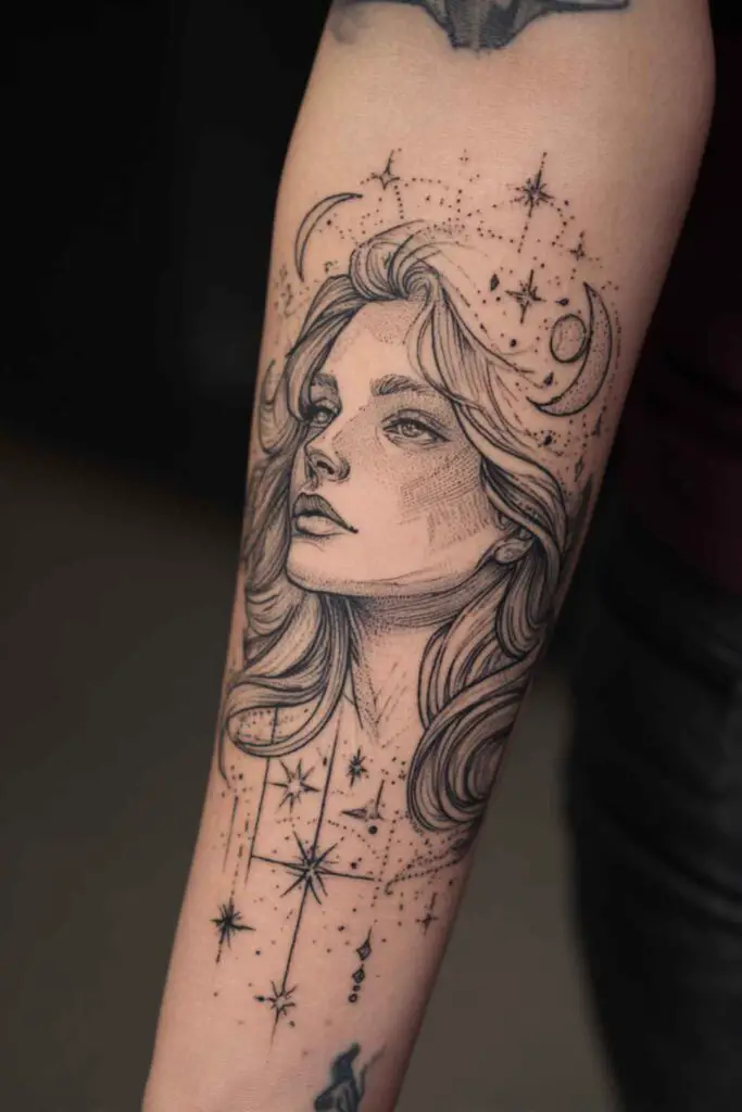 A half sleeve tattoo featuring a celestial goddess surrounded by gentle stars, moons, and glowing lines creates a mystical and elegant design. The goddess embodies feminine power and wisdom, rendered with soft, flowing lines that capture her serene presence.