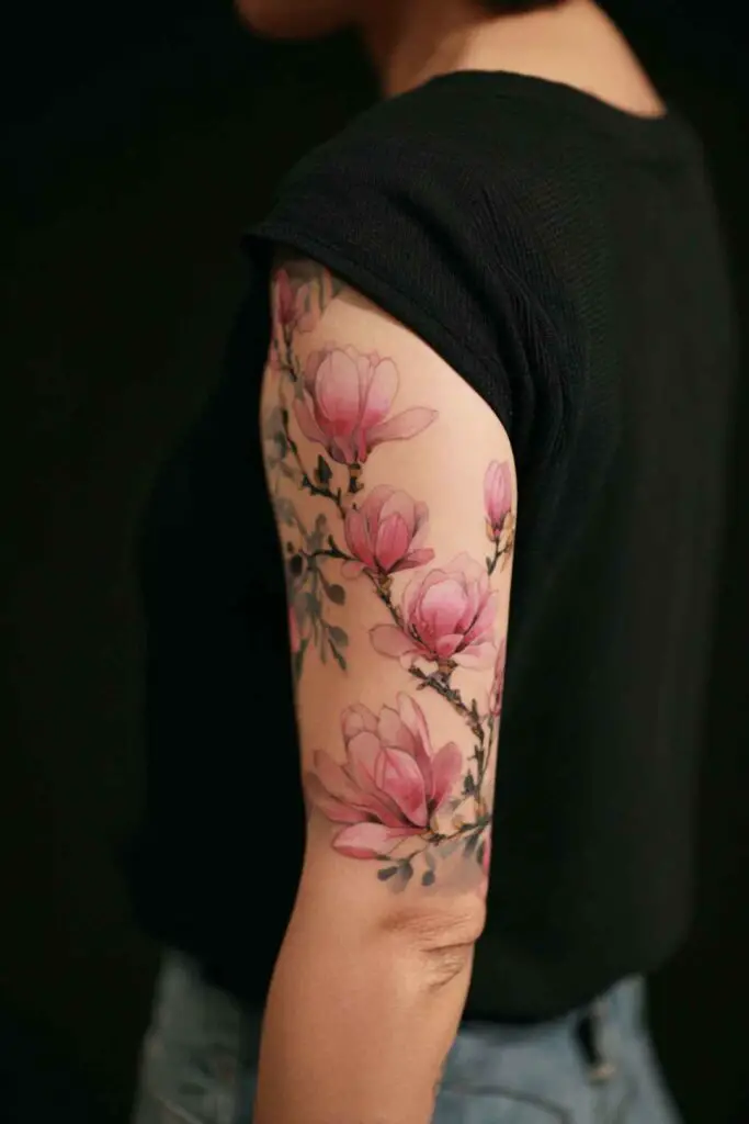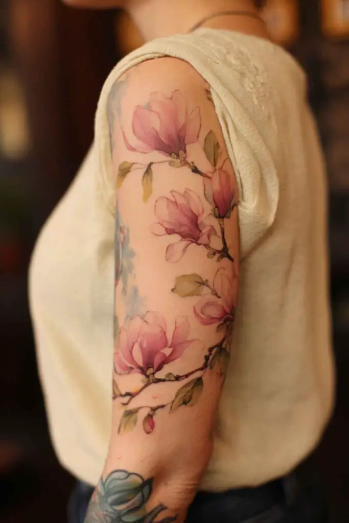 A half sleeve tattoo featuring magnolias with soft watercolor-style shading offers a delicate and refined design full of natural beauty. Magnolias symbolize nobility, perseverance, and feminine sweetness, making them a meaningful choice for a classy tattoo.