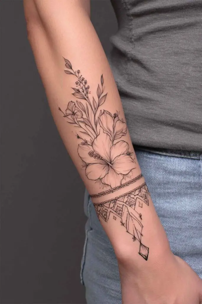 Wildflowers bring spontaneity and softness with their varied shapes and subtle colors, enhancing the tattoo’s organic appeal. Together, these plants form a harmonious blend that wraps gently around the arm, emphasizing femininity and connection to nature.
