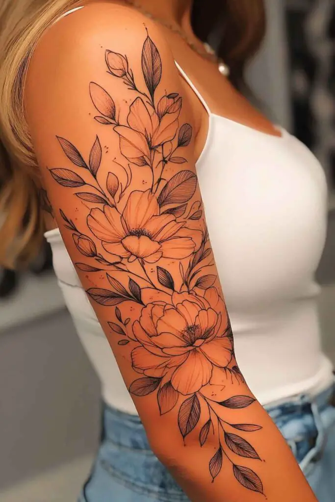 The flowing composition wraps elegantly around the arm, emphasizing grace and subtlety. This tattoo suits women who want a sophisticated half sleeve that highlights both artistic creativity and timeless floral elegance.