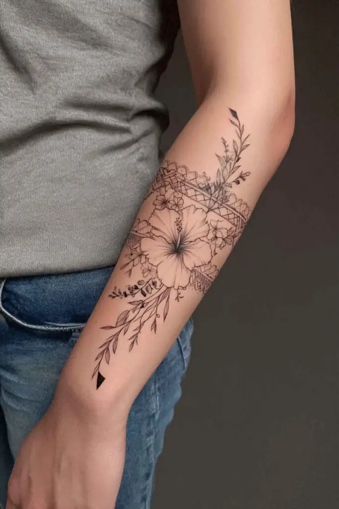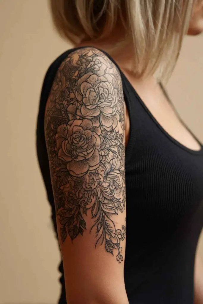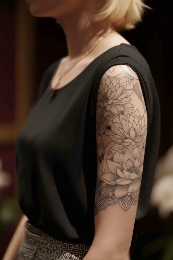 Such a design appeals to women seeking a graceful yet meaningful tattoo that highlights nature’s beauty with a delicate, artistic touch, perfect for a half sleeve that remains both sophisticated and expressive.