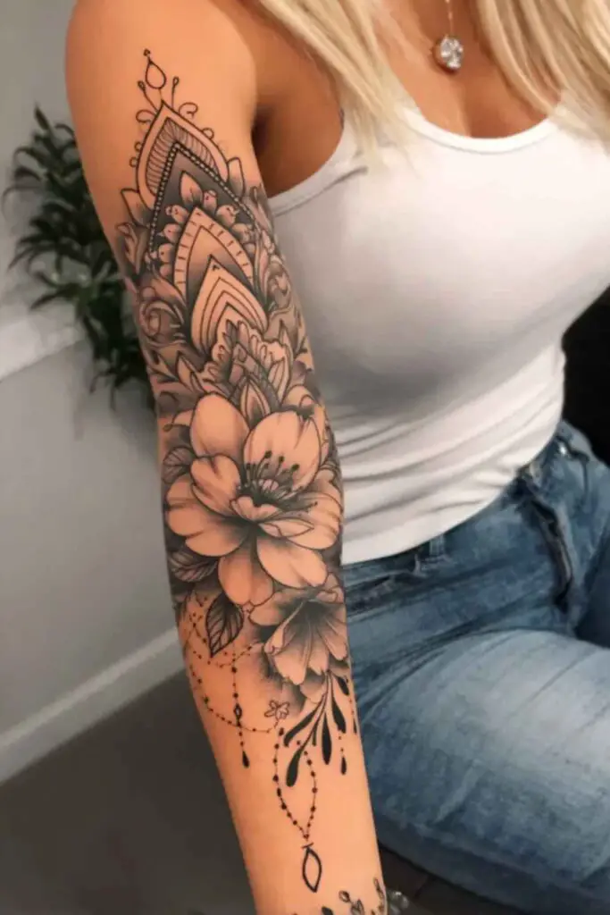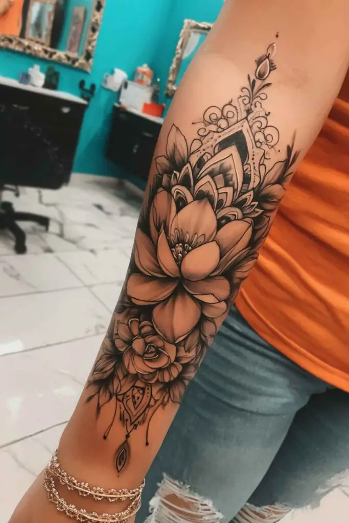 As the design expands outward, it gracefully transforms into soft, blooming flowers that wrap around the arm, adding a natural, feminine touch. This combination of structured mandala art with delicate floral motifs creates visual contrast while maintaining a cohesive flow.