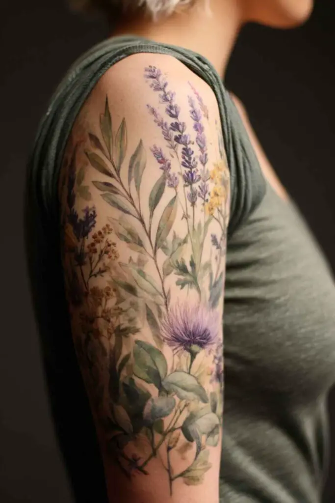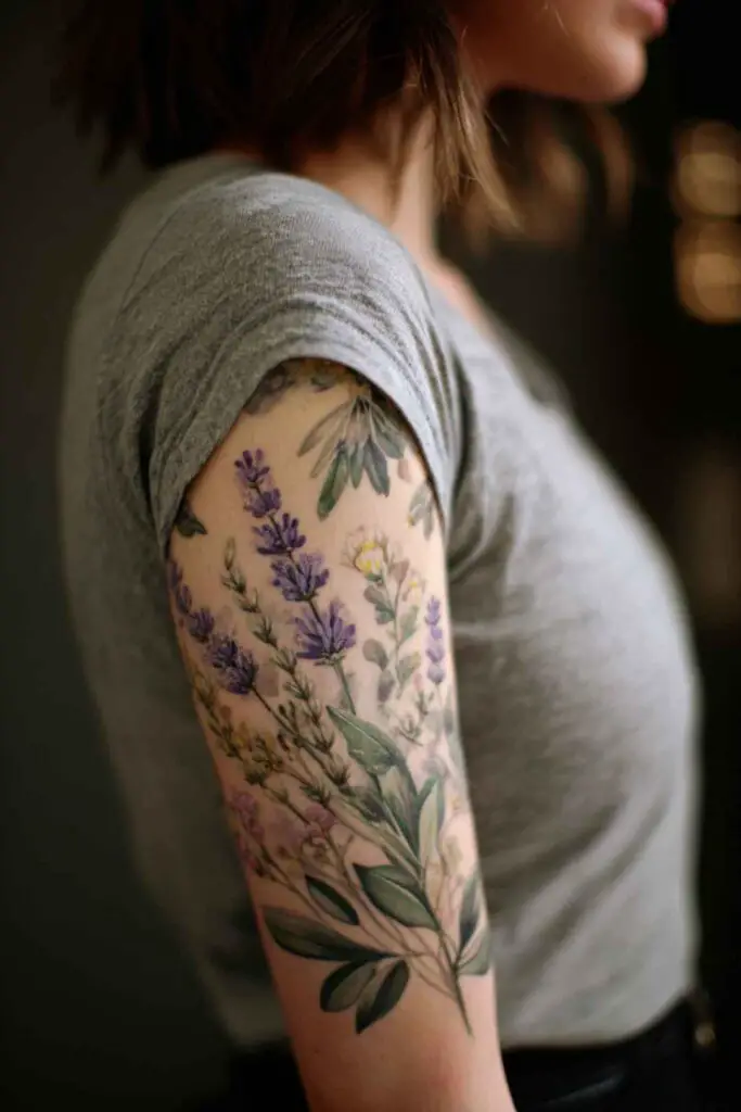 A botanical half sleeve tattoo featuring lavender, eucalyptus, and wildflowers creates a beautifully natural and elegant design. Lavender, with its slender stems and delicate purple blooms, symbolizes calmness and grace, while eucalyptus leaves introduce a fresh, flowing element that adds texture and balance to the composition.