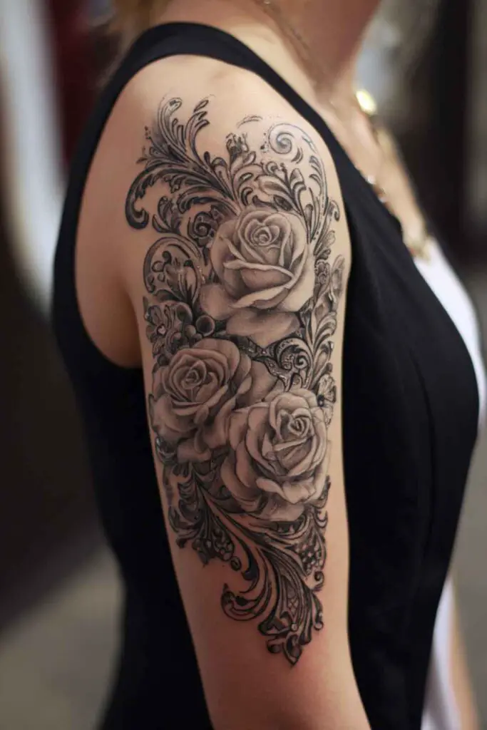 These elegant shapes, such as filigree or lace-inspired patterns, weave seamlessly through the roses, enhancing the tattoo’s flow and structure.