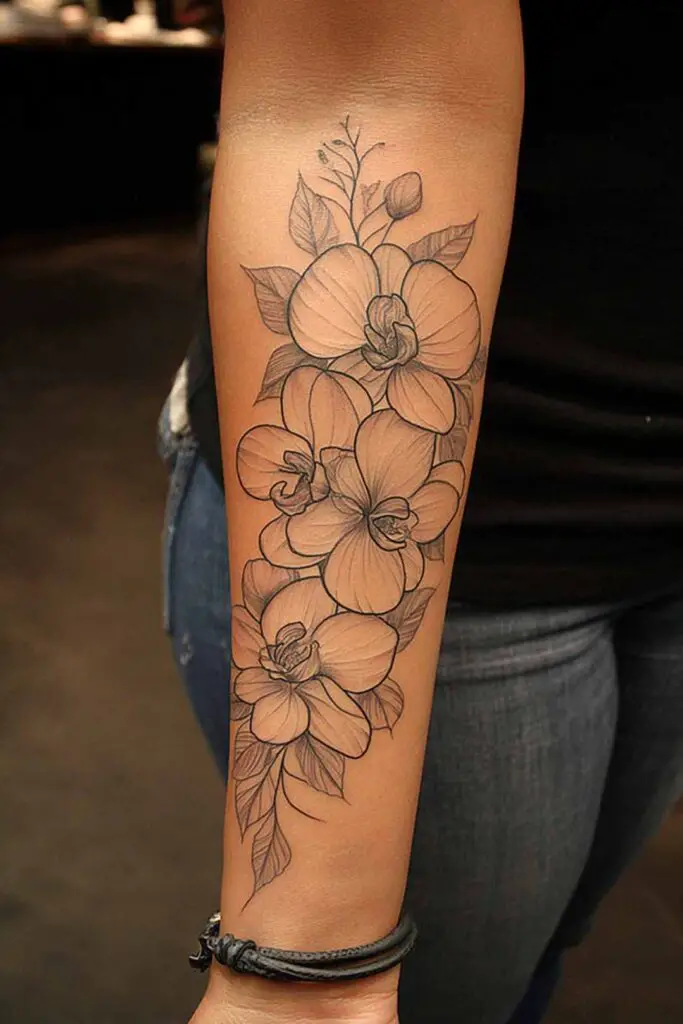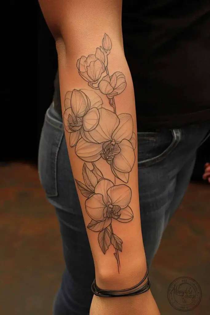 A floral half-sleeve with orchids and subtle linework leaves graces the forearm in exotic elegance, where exotic Phalaenopsis blooms cascade from wrist to elbow, their ruffled lavender and white petals unfurling in delicate clusters that evoke rare beauty and refined strength.