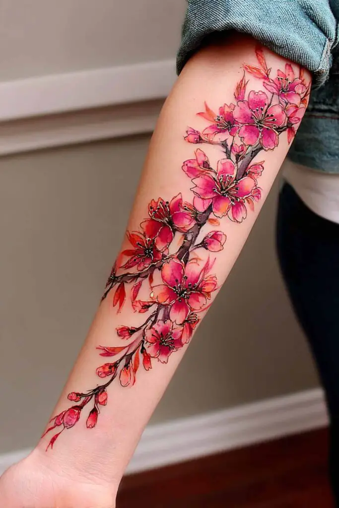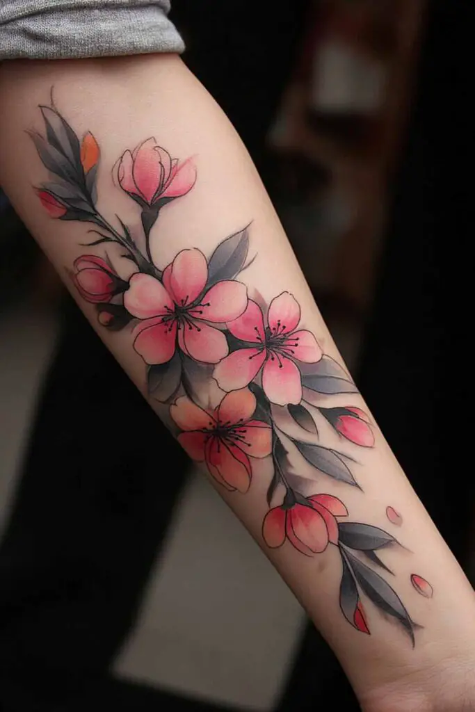 A combination of cherry blossoms drifting along the arm evokes ephemeral spring poetry in a half-sleeve floral masterpiece, where soft pink petals cascade gently from elbow to wrist like whispers of wind-scattered sakura, their delicate clusters tumbling in rhythmic waves that follow the forearm’s elegant curve.