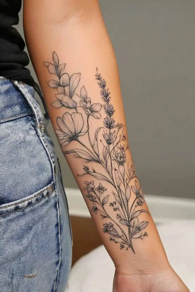 4. Wildflowers spiraling up the forearm with soft details.