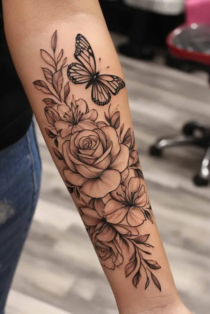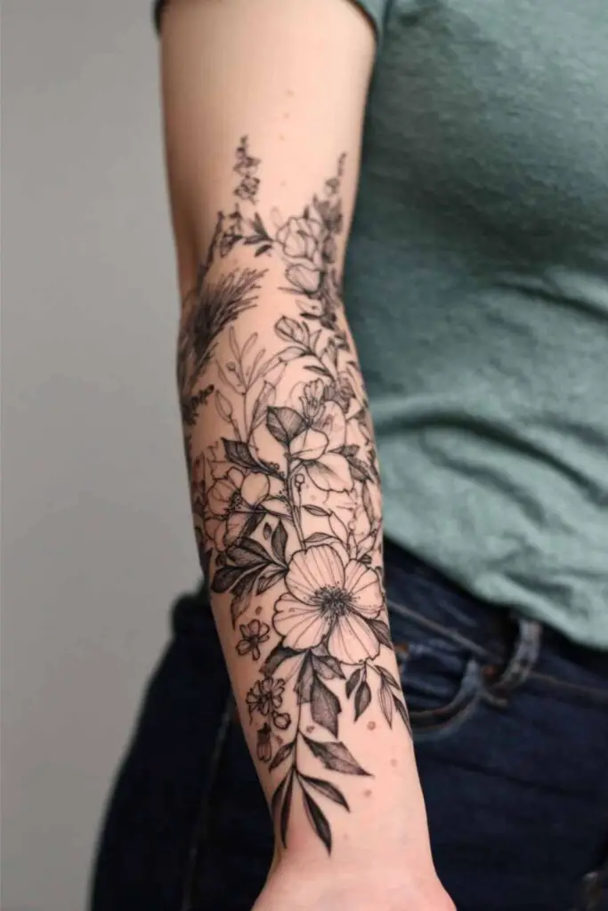 Floral half sleeve tattoos on the forearm capture nature’s enduring poetry, wrapping the arm in symbols of growth, resilience, and beauty that bloom eternally against the skin.