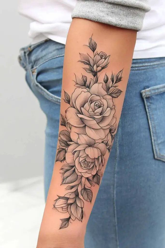 A cascading bouquet of roses tattoo unfurls from wrist to elbow like a romantic torrent of passion, where lush crimson and blush petals tumble in lavish clusters, their velvety layers catching light with every twist of the arm.