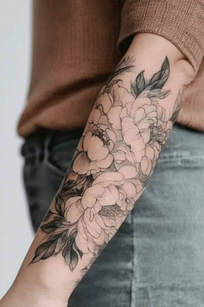 A half-sleeve of peonies bursts across the forearm in opulent glory, where lush, ruffled petals layer in voluptuous clusters from wrist to elbow, their bombastic blooms capturing spring’s extravagant rebirth.