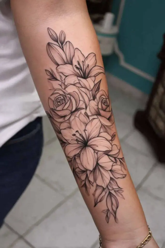 A mix of lilies and roses blends into a flowing composition across the forearm half-sleeve, where elegant white lilies with recurved petals intertwine seamlessly with voluptuous crimson roses, their stems merging in a sinuous river from wrist to elbow that mirrors the arm’s graceful taper.