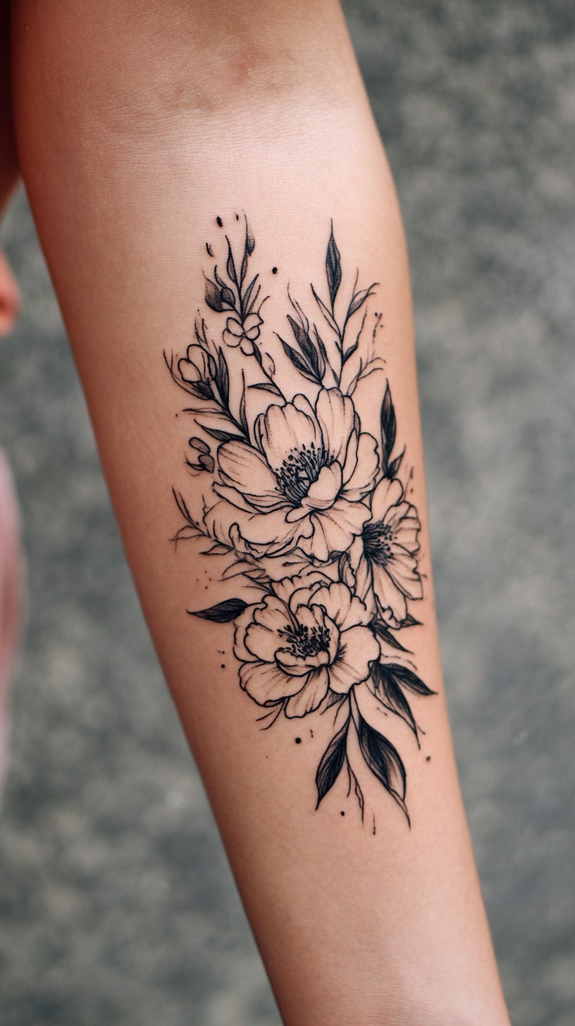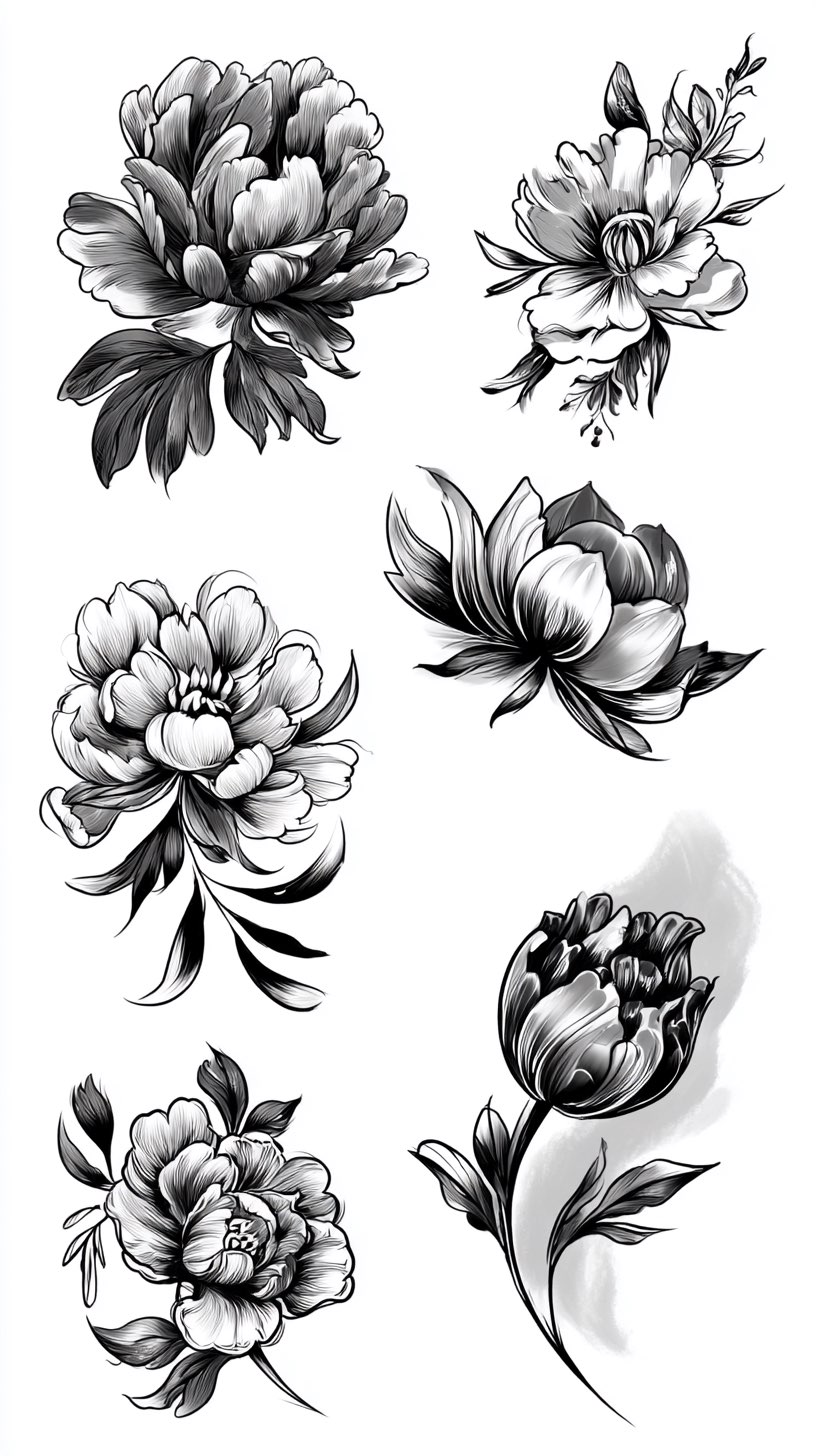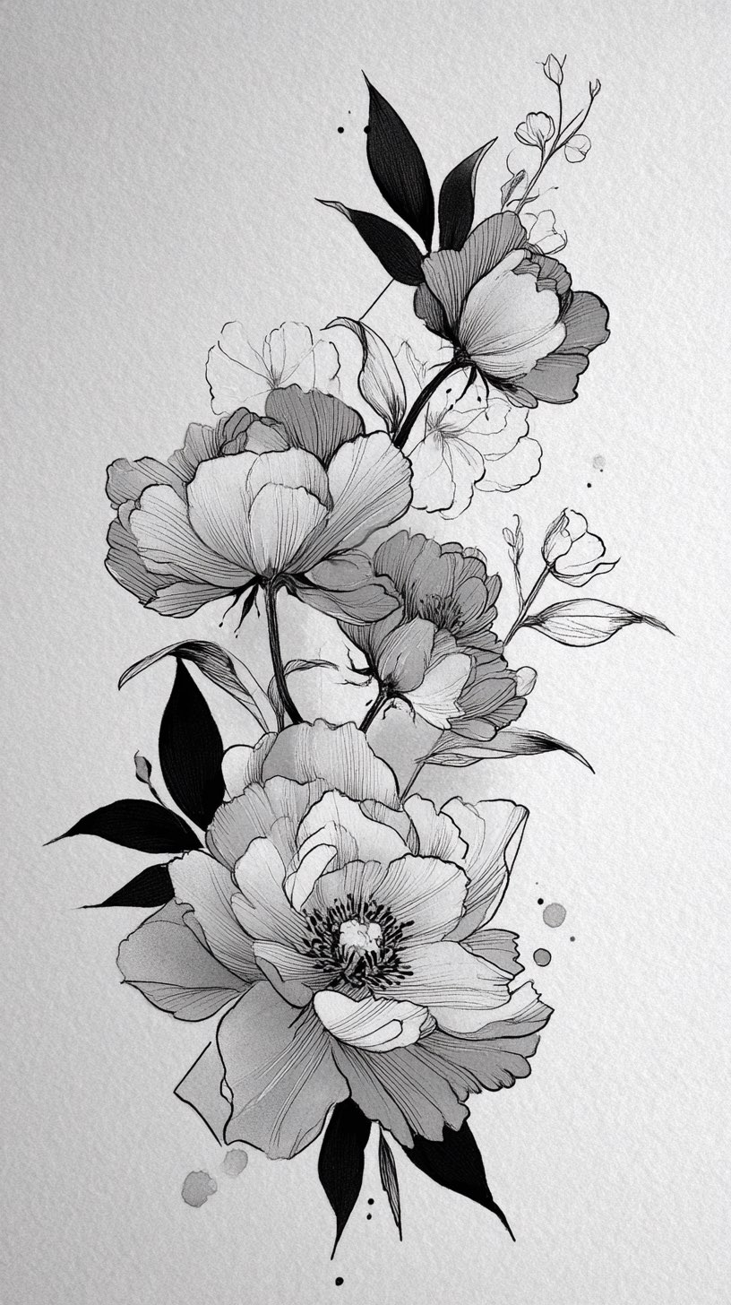 Black and gray floral tattoos offer sophisticated elegance through masterful shading and contrast. Without color to rely on, these pieces showcase artistic skill through depth, dimension, and detail.