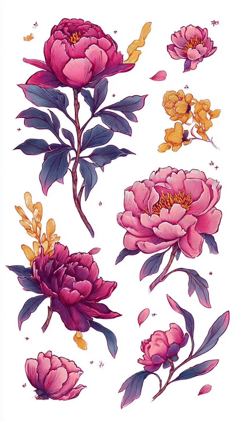 Peonies represent prosperity, romance, and honor in many cultures. Their lush, layered petals create dramatic visual impact that fills space beautifully. These statement blooms are often featured in Japanese traditional tattoo styles.