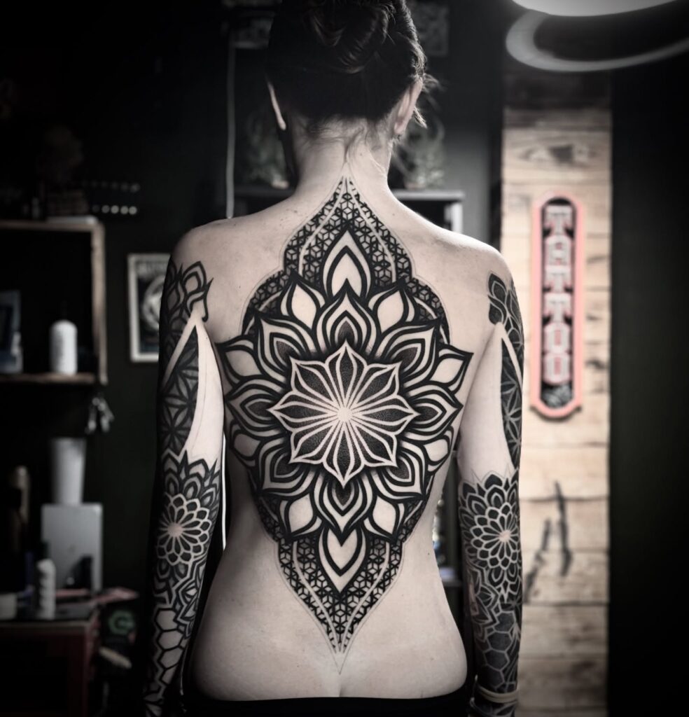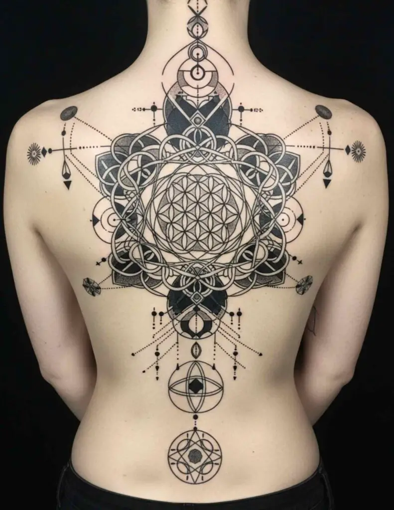 A large central mandala with secondary botanical or geometric elements radiating outward toward the edges of the back. The mandala’s circular symmetry creates a natural focal point. The surrounding elements frame it without competing. In fine line or dotwork, the precision required is extraordinary.