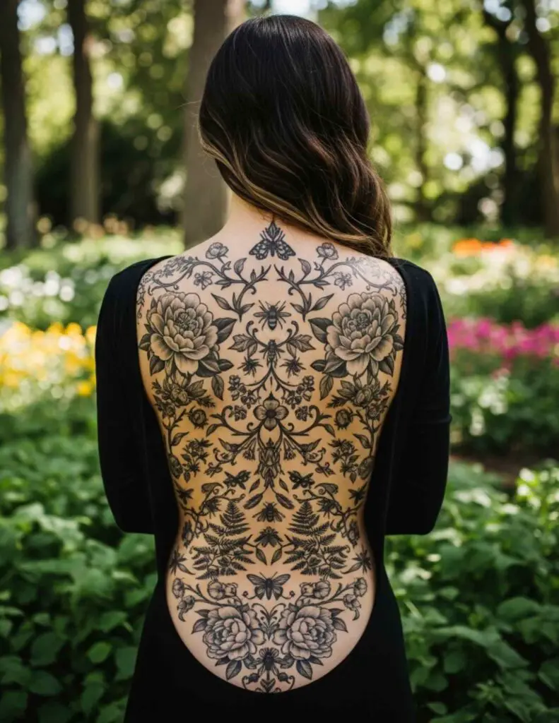 An abundant arrangement of botanicals covering the full back. Roses, peonies, dahlias, wildflowers, trailing vines, and leaves. Lush, abundant, and gloriously complex in colour realism or fine line. A botanical back piece celebrates the body as a garden.