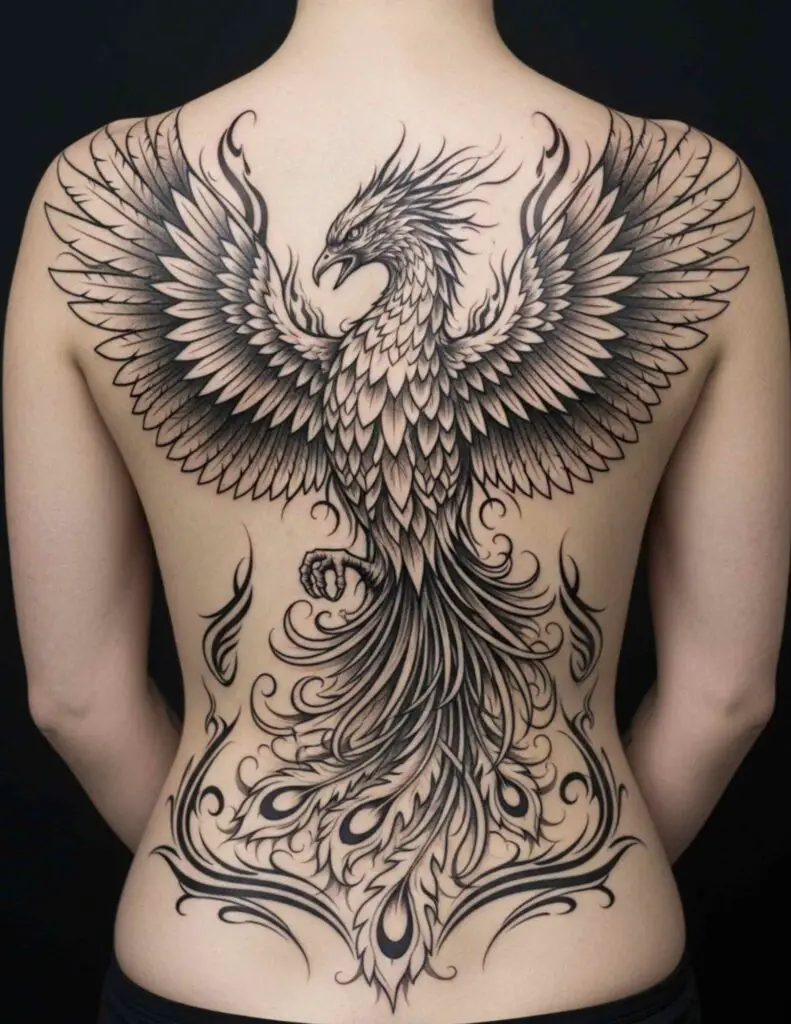 A phoenix with wings filling the upper back, body ascending the spine, tail feathers trailing into the lower back. The phoenix at this scale is magnificent. The fire and the bird can fill every inch of the canvas and the vertical energy of the rising bird works naturally with the back’s orientation.
